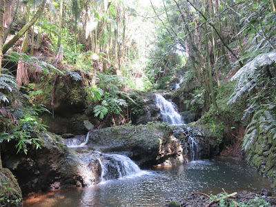 On the way back to Hilo, we explored options for lunch on Trip Advisor and made a great choice - Pineapples - where we had a delicious lunch. After eating, we drove up the hill to see Rainbow Falls on the Wailuku River, the site of another of the Hawaiian legends. The god Maui did battle here against a giant mo'o, or lizard, named Kuna, who was causing trouble for Maui's mother, Hina. After my recent trip to Mo'orea, which means "yellow lizard," I was fascinated to see the obvious language connection between the Tahitian and the Hawaiian language.